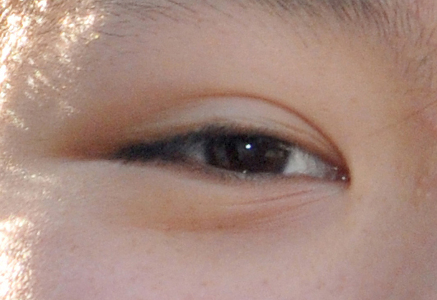 [作例(2)]から4は味も素っ気もない写真ですみませんがキャッチライトの見本です。[作例(2)]はキャッチライトが入っていない状態です。やっぱり黒目が真っ黒だと「生き生きした目」という印象になりません。