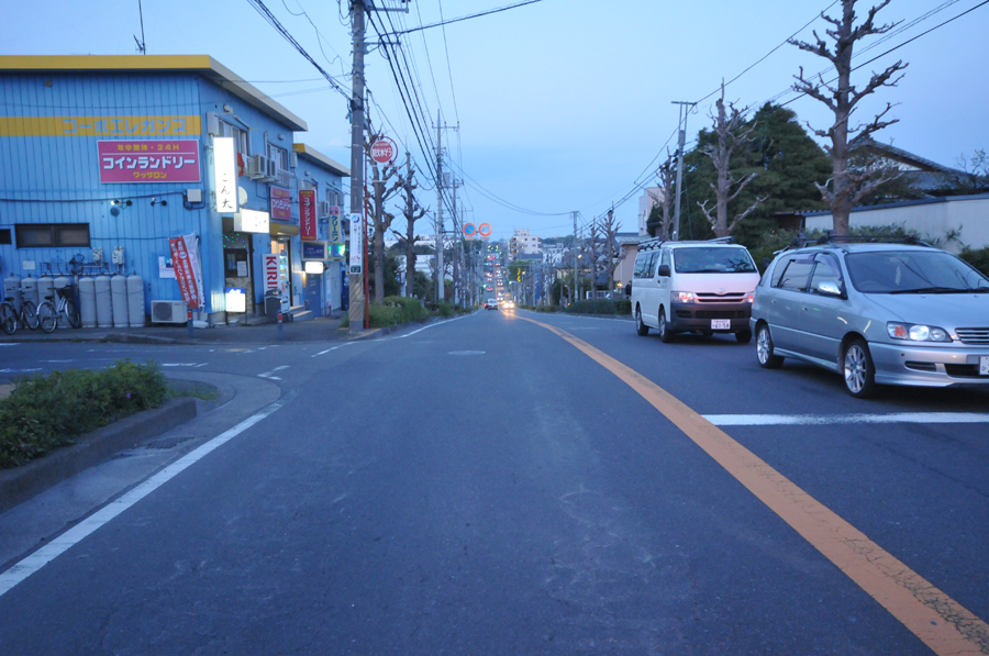 まずは傾斜を表現する為には比較するものが画面内にあったほうがよいだろう、と考えました。幸い自宅のまわりに坂道がたくさんあるので、カメラを持って撮りにいきました。とりあえず下り坂を撮ってみる事にしました。昔スキーに行ったとき、いざ斜面の上に立ってみったらものすごい角度に見えたことを思い出したからです。[作例(1)]は近所の坂道で、一度下って下りきったところから上り坂になっている場所です。[作例(1)]が車道、[作例(2)]が同じ道路の歩道です。こうしてみると[作例(2)]の歩道のほうはまったく坂道に見えません。これは途中にある木が邪魔になって道の先にある上り坂が遮られて見えない上に道の傾斜と比較できるものがほとんど写っていないためだと思います。