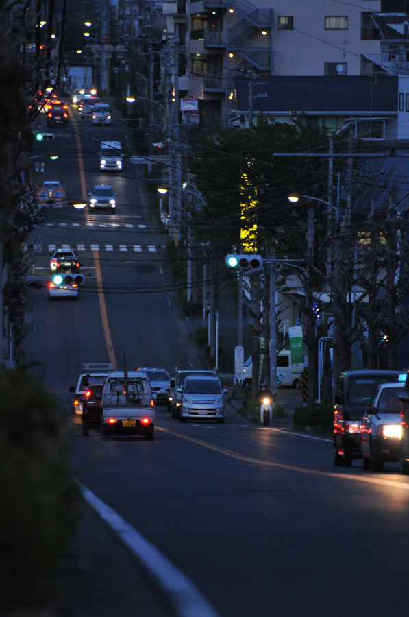 次にもう一度[作例(1)]を撮った場所に戻って奥のほうの上り坂を望遠で撮ってみました[作例(6)]。かなり急で長い上り坂であることがわかると思います。角度を比較する為に手前の下り坂部分をフレーミングに入れたのと道の脇にある電柱の列が上り坂の傾斜を比較するための素材です。車があることで、坂道の長さもわかりやすくなっています。手前の下り坂が水平の道に見えてしまうのは、ここが下り坂だということを比較する素材がフレーミングに入っていないためだと思います。実際に他の場所でも試して見ましたが、一番手軽に坂道の傾斜を強調するには手前の坂になっていない(傾斜のない)部分を画面に入れつつ、望遠で遠くから「上り坂」を撮るという方法でした。今回の撮影で改めて「坂」を撮ってみましたが、坂道はドラマチックなイメージを作りやすい素材でした。そのうち「坂」と何かを組み合わせて撮ってみたいと思います。