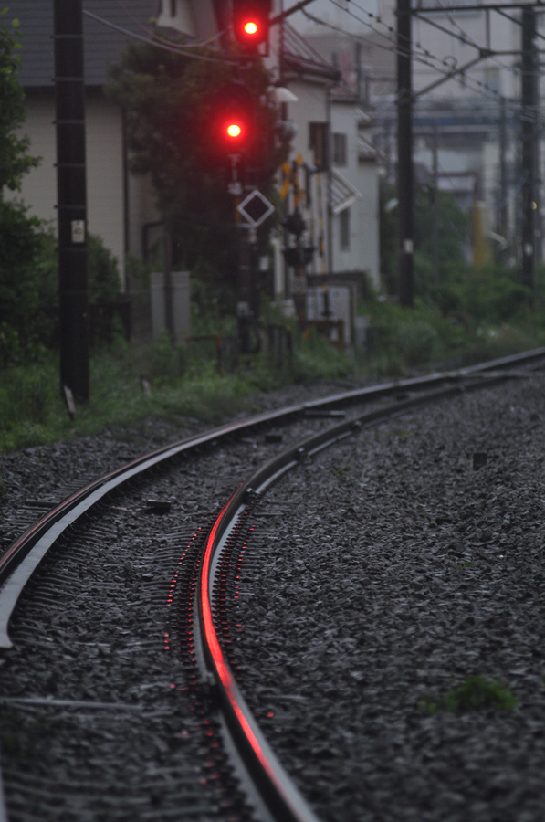 [作例(2)]は赤信号を線路に映してポイントにしてみました。こういった沈んだトーンの写真にはハイライトが存在感のあるアクセントになります。赤信号(青より赤がおすすめ)や車のテールランプなど、特に赤い色は目立つのでアクセント素材にお勧めです。作例2では信号が線路に映りこむ角度を探してアングルを決め、赤が反射した部分にピントを合わせて撮りました。