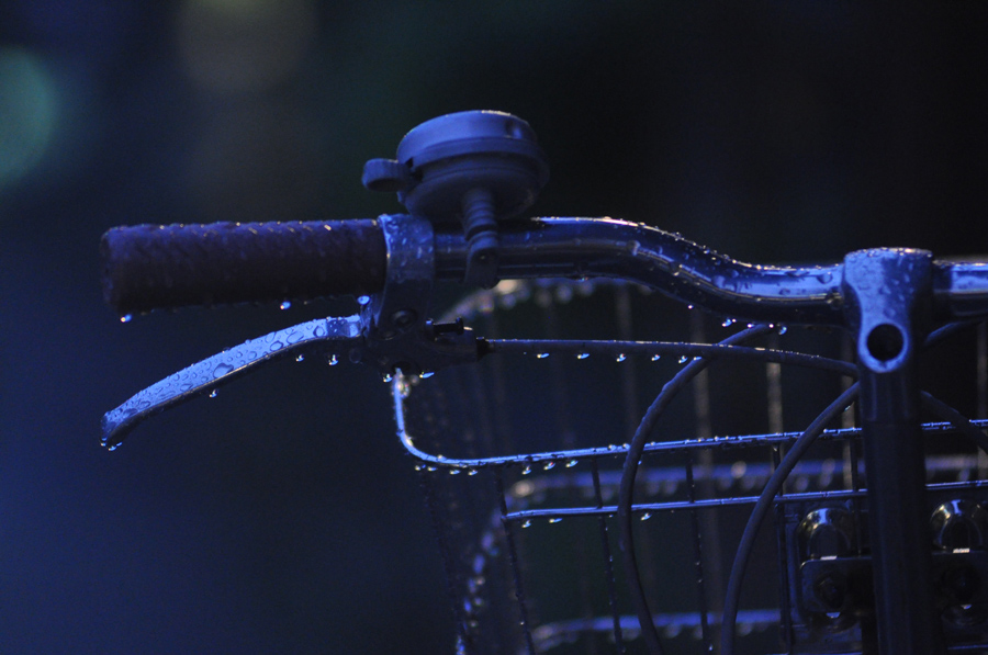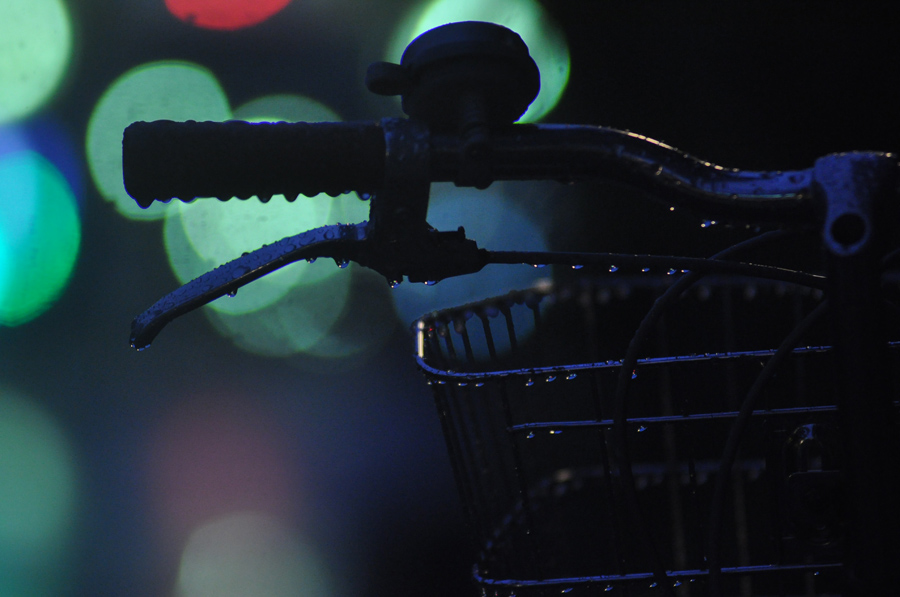 前にも説明しましたが雨の雫は暗い背景に載せましょう。[作例(3)(4)]を撮ったときはかなり暗い時間帯で、すでに夜景の撮影に入るレベルの暗さでした。道端の自転車が雨に濡れてぽつんと置かれていました。それを背景にお店の明かりが入る角度で撮ったのが[作例(3)]です。ハンドルのグリップ部分やブレーキレバーについた雫が黒くつぶれてしまっています。水の雫は逆光に光ることでハイライトになり、小さな雫でも目立つことが出来るのですが、明るい背景に乗ってしまったので黒くつぶれてしまったのです。[作例(4)]は同じようなフレーミングで撮った写真ですがわずかにアングルを変えて暗い背景だけで撮っています。こうすると、雫がハイライトになって引き立ってきます。雫は暗い背景で撮りましょう。
