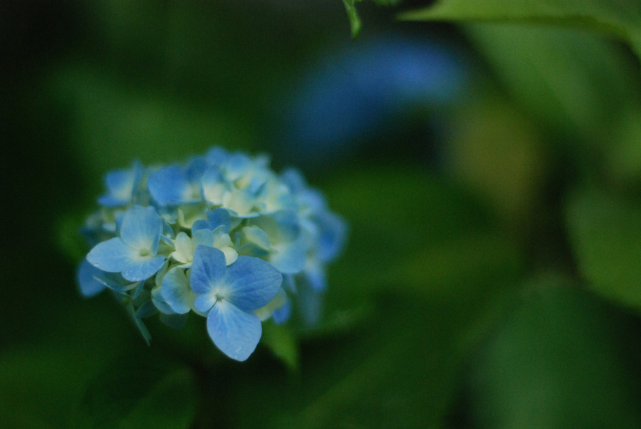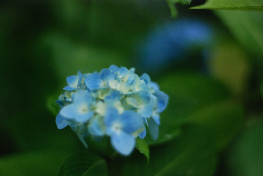 普通、花の写真ではピントはシベにあわせるのが基本です。まあ、あくまでも「基本」であって「絶対」ではないのですが。ところがアジサイのように、小さな花が集まって手毬状に咲いていると、普通の花の基本である「シベにピント」というわけに行きません。小さな花がいっぱい集まっているからです。[作例(1)]と[作例(2)]は明るいF1.4のレンズで開放で撮っています。非常にピントが薄くボケが大きいのでどこにピントを合わせたのかがわかりやすい写真です。[作例(1)]は手毬状にさいたアジサイの中央部というかてっぺんの当たりの小花にピントを合わせています。一見したイメージでいくと「ん?ピンボケか?」という印象の写真になってしまっています。