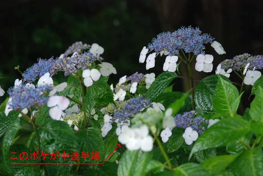と言うのが失敗の原因です。正直言ってこれならこのボケはないほうがよい、と言っていい状態です。ぼかすなら[作例(4)]くらい思い切りぼかしましょう。これは単純に絞りを開ければいいということではありません。前ボケはカメラに近いほど大きくボケますからボケ素材に近づいて撮れば、大きくぼかす事ができます。近づけは大きく写りますから(1)の大きさの問題も解決します。このような点にも注意して、きれいなアジサイを撮ってみましょう。
