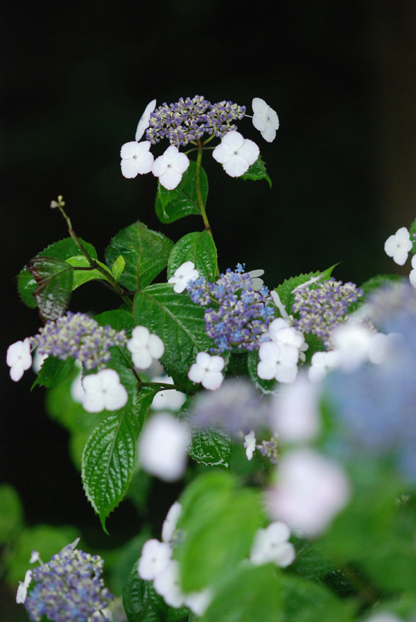 アジサイは群れて咲いているので脇役に主役以外の花を前ボケや後ボケとして使うこともよくあります。このボケですが、中地半端なボケを作ってしまうとかえって目障りな存在になってしまうことがよくあります。[作例(3)]は手前に小さめのアジサイがボケて写っていますが、これがちょっとじゃまな印象です。まず、