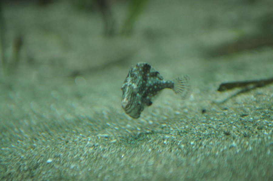 なにしろ水族館は暗いのでちょっと油断しているとすぐにぶれます。手ぶれだけでなく被写体ぶれも多いのでできるだけ速いシャッター速度を使いたいところです。被写体ぶれは魚が動くことでぶれてしまうので魚の動きにも注目してみましょう。魚も魚種によって活発に動き回っている魚と比較的動きのすくないものがいます。特に底のほうにいる魚は動きが少ないので、ビギナーカメラマンでも撮りやすいと思います([作例(2)]シャッター速度1/125秒)。