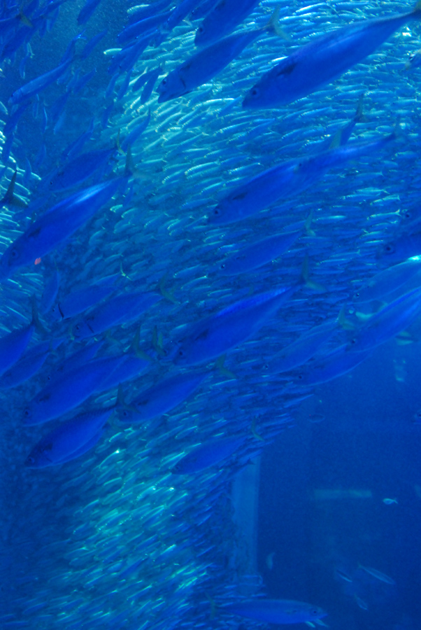 大水槽などを広角で撮るのが失敗の少ない方法なのでビギナーカメラマンにはおすすめの方法です。まず広角のほうがピントが深い、要するに広い範囲にピントが合っているようにシャープに」写るのでマクロレンズほどシビアなピント合わせに神経を使わなくても大丈夫です。また、ぶれも目立たないので動きの速い魚を撮ることも比較的簡単にできます。アップでは撮れませんが、魚の群れなどを全体で撮ったり大きな魚の全身を撮るのもいいと思います。[作例(4)]は手前にアジ、奥にはイワシの群れが舞っています。どちらも動きの速い魚で撮影した時も活発に泳いでいました。しかしそれほど寄って撮ったわけでもなく広角で撮っているのシャッター速度は1/125秒ですがほとんどぶれは気になりません。こういった水族館の写真はぶれてたりピンボケだと、いかにも「失敗作」という印象になってしまうので、注意して撮影しましょう。