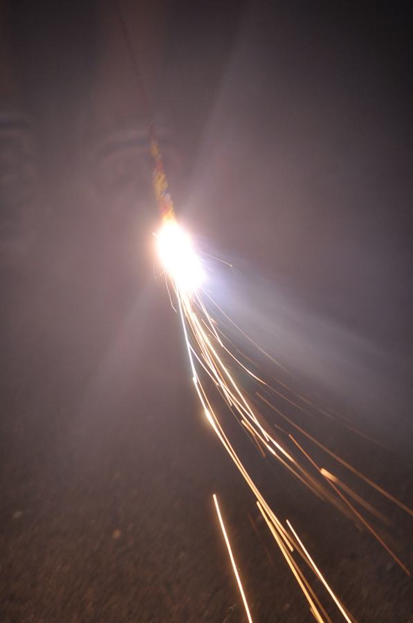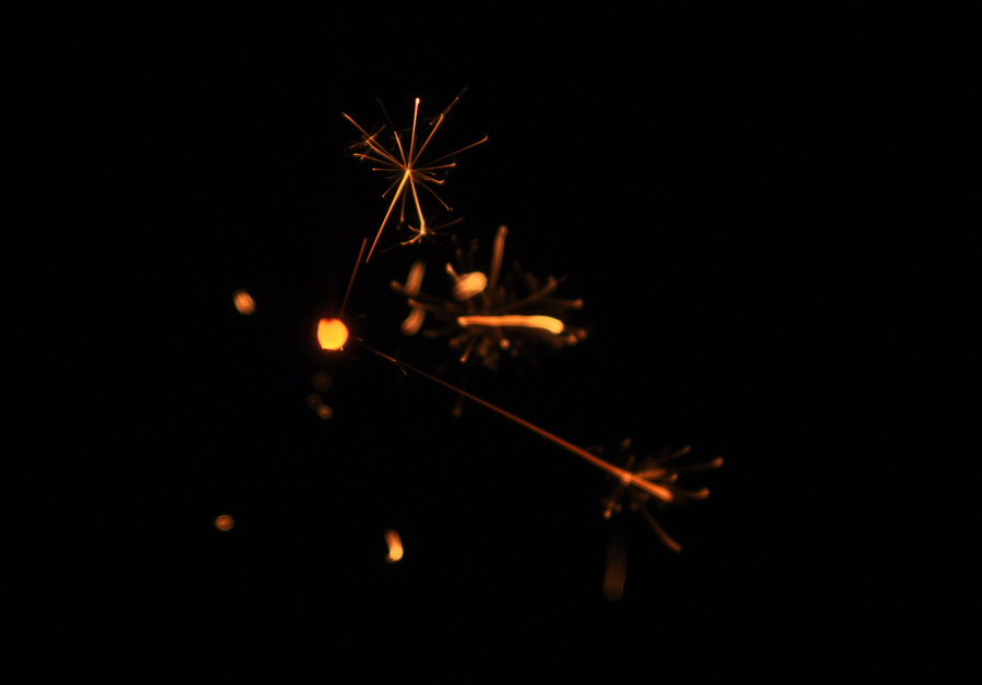 手持ちの花火と言えば線香花火。個人的にはこれが一番絵になる花火だと思います。地味で小さな花火なのに一番風情があると思います。作例4はISO400、F4.5 、シャッター速度1/25秒で撮りました。線香花火は短命なのでパチパチと爆ぜてきたら続けてシャッターを切りましょう。この作例も何枚も撮った中のひとつです。もっと景気よく火花を散らせている写真も撮れましたが、私は個人的にこのカットが好きです。線香花火自体が玉を落とさないようにするのが難しいので、風のない場所でカメラの準備ができてから着火するようにしましょう。