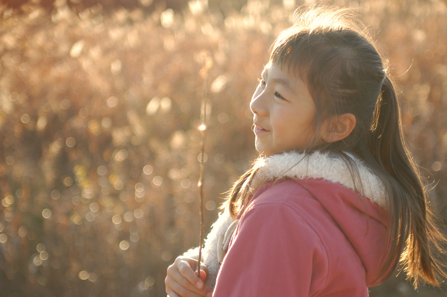 低い位置に太陽があると逆光も使いやすくなります。人物の写真の場合一番よく使われる光が逆光ですが、太陽が高い位置にあると完全な逆光にするのは難しく、どうしても斜め上からの半逆光になってしまいます。朝や夕方なら低い太陽からの光になるので逆光も半逆光も使いやすくなります。[作例(3)]はわずかに左よりの逆光で撮っています。髪に当たった光も顔のシルエットに沿った反射もきれいに出ています。高い反逆光ではこうはいきません。背景は草むらですが、草に反射したボケも夕方らしいアンバー系の色のボケになっています。このように人物のポートレートなどの場合は朝か夕方の時間帯がお勧めです。機会があったら試してみてください。