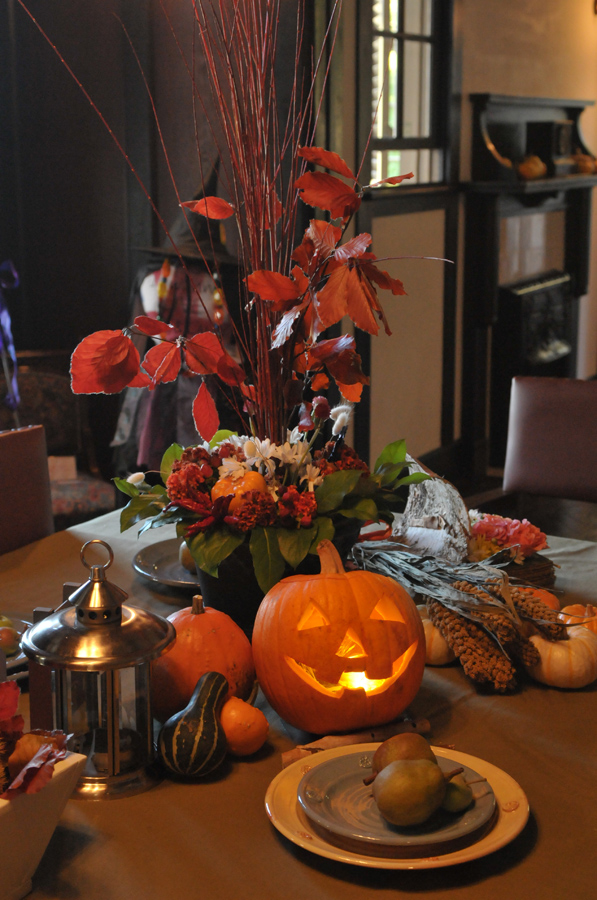 ハロウィンのイベントをやっている洋館で、カボチャのランプを飾ったテーブルを見つけました。全体に秋っぽいイメージのテーブルセッティングで花やクロスなども暗めの色調でまとめられていました。カボチャの周りの飾りも入れて一枚撮ってみたのが作例1です。このままだとちょっとカボチャランプのインパクトが弱い感じです。背景をぼかすことでカボチャを主役にしようとしましたが、背景に窓が入っているため画面内にランプよりも明るい部分が出来てしまったことが大きな原因のひとつです。暗い中のハイライトは画面内で結構目立ちます。ですから下手にハイライトを画面内にフレーミングしてしまうと目をひいてしまい、主役の存在感を損なってしまうことがあるのです。この場合のように全体が暗いトーンで占められているときは、主役のカボチャに視線を集中させるため、余計なハイライトを入れないようにしましょう。