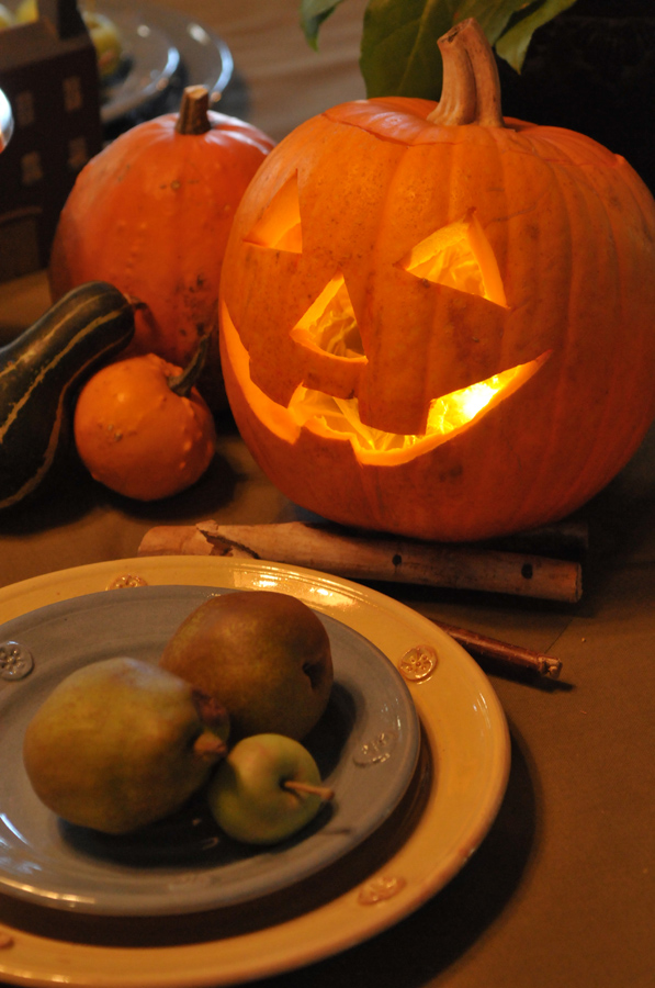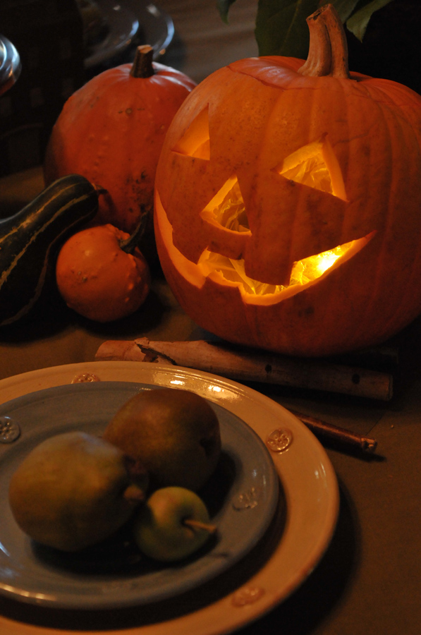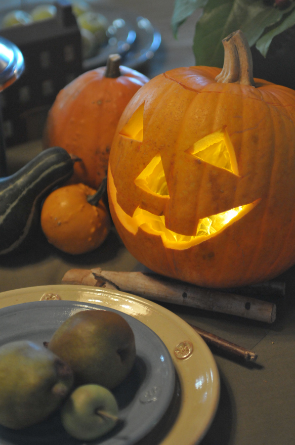 ちょっとよってカボチャのアップを中心に周りにすこし脇役を入れて撮ったのが作例2です。この部屋の照明はタングステン灯でした。タングステンの明かりは赤っぽい色がかぶるため暖かみのある色になりますが、WB〔ホワイトバランス)をオートに設定していたため、この赤みを消すためにカメラが色を補正しています。色については人それぞれの好みがありますので、「こうじゃなきゃだめ」などと言うつもりは毛頭ありませんが、私はもうちょっと暖かい色合いにしたかったのでWBを太陽光に設定して撮り直しました。それが作例3です。こうするとカボチャのランプのオレンジ色っぽい光の色はそのままオレンジ色に写りますし、カボチャの色もオレンジ色で暖かいイメージの色合いになります。
