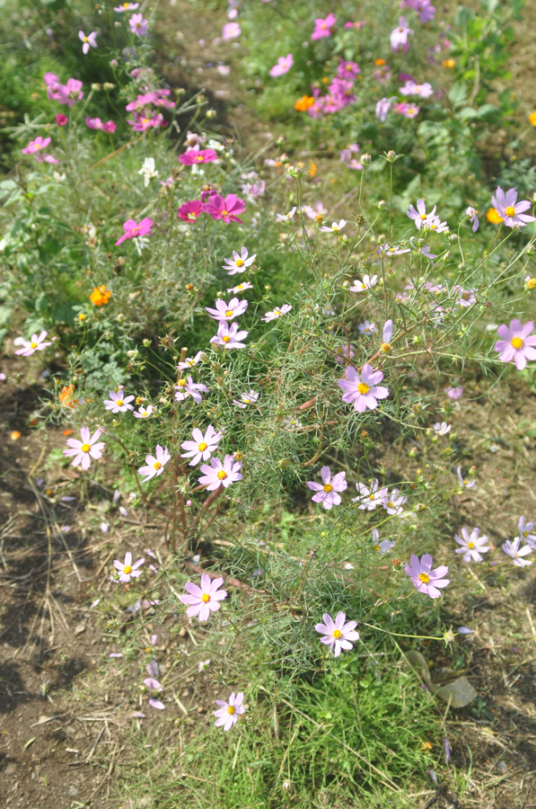 コスモスはたいてい群生しています。濃い赤紫色やピンク、白などいろいろな色がありますが、まずは自分の好きな色、姿かたちのコスモスを探しましょう。花畑のように一面に咲いている場所なら引いて撮ってもいいのですが今回はアップ中心に撮ります。アップだと花びらの汚れや枯れが目立ちますので、なるべく花びらが瑞々しく、気に入った色の花を探しましょう。今回はちょっと見ごろが過ぎてしまったタイミングでしたが[作例(1)]の株を使って撮ることにしました。この写真を見るとかなりしょぼい感じではありますが、よく見ると花びらが細めで繊細な感じの花をつけていたのが気に入りました。さて、この繊細な感じを生かして写真を撮ってみましょう。
