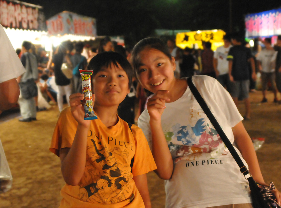 子供に屋台で買ったものを持ってもらって撮ったのが[作例(1)]と[作例(2)]です。[作例(1)]のほうはお祭りの会場の端のほうで屋台の裏みたいな場所でした。これでは暗くてストロボなしでは撮れません。それに背景が暗くてお祭りらしい雰囲気も感じられませんでした。[作例(2)]のほうは会場のメインになる通りで撮った写真です。背景に屋台がたくさん写っていてその場の雰囲気がよくわかります。お祭りの写真では周りに人がまったくいないと帰ってさびしい絵柄になってしまいます。しかしこのような写真の場合子供のすぐ後ろに人がいるのも目障りです。ちょっと遠くに人ごみがあるくらいがちょうどいいので、なるべくギッチギチに混んでいる場所ではなく、周りにちょっと余裕がある場所をさがしましょう。この場所ではISO3200にセットしてノーストロボで撮りました。