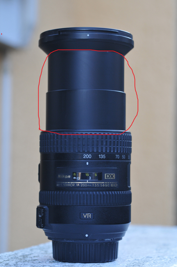 写真(1)は私のレンズです。運動会から帰宅したあと掃除しておいたのですが、どうやら撮影中に入ったゴミのようです。なにしろ一日中ホコリ舞う校庭で持ち歩いていたのですから考えてみればこういうこともあるわけです。かなり派手に入ってしまっています。こうなるとメーカーに出すしか掃除する方法がありません。思わずでた「ホコリが入った」という私の呟きを隣で聞いていたカメラマンが「ホコリぐらい平気だよ~」と他人事だと思ってのんきな発言をしていましたが、当人はここまで大量のほこりが入っているとは思っていないでしょう。写真(2)はズームで望遠側の200ミリにしたときで写真(3)は広角側の18ミリにしたときです。今回はおそらく写真(2)の赤線で囲んだ部分にホコリがつき、ズーミングを繰り返すたびに、レンズ内部にホコリが侵入したものと思われます。帰宅後、掃除したときはこの部分ももちろん掃除しましたが、帰宅した時にはすでに内部にホコリが入ってしまった後だったようです。