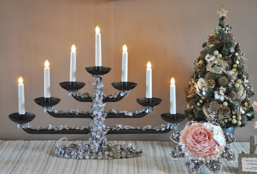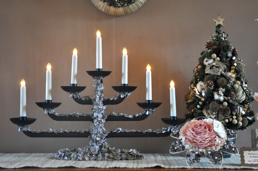 作例(2)と作例(3)はツリー型の飾台とツリーの飾りを撮った作例です。同じような撮り方をしていますが作例(2)のほうが全体的にすっきりした印象になっています。それは作例(2)のほうが画面全体がシンプルになるように考えてフレーミングした写真だからです。作例(3)はしゃがんで撮った写真です。そのため後ろの壁にかかっているフレームの一部が画面上に入ってしまっています。また、飾台の下のマットの手前端が画面に入ってしまっているのもすっきり感を損なっている原因です。逆に立ったまま撮影した作例(2)はアングルが高いため、うしろのフレームをギリギリでフレーミングから切ることができます。また、上から見下ろす形になるので、下に敷いたマットの端も画面から切ることが出来ました。フレーミングを考えるときは余計なものを切るためにアングルも考えてまいましょう。この作例の場合は左右が画面いっぱいなのでズームで邪魔なものを切るのは難しい状況です。しかし、ちょっとカメラの高さを変えただけで邪魔なものを切ることが出来ました。このようにちょっとした違いが写真全体の印象を左右します。フレーミングを決めるときは画面の隅々までチェックして考えましょう。
