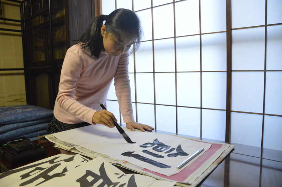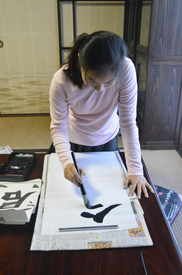 さらにもうちょっと低い位置からカメラをかまえて撮ったほうが顔が写るので表情がわかりやすくなります。このときの筆を持つ手の位置ですが、出来るだけカメラに近いところを書いているときのほうが迫力が出ます。つまり半紙の上のほうの一文字目を書いているときです。ピントは顔に合わせて撮りました。顔が下を向いているので暗くなってしまうのを避けるため+1補正をかけています。障子が画面に入らないようにすればこの程度の補正で大丈夫です。