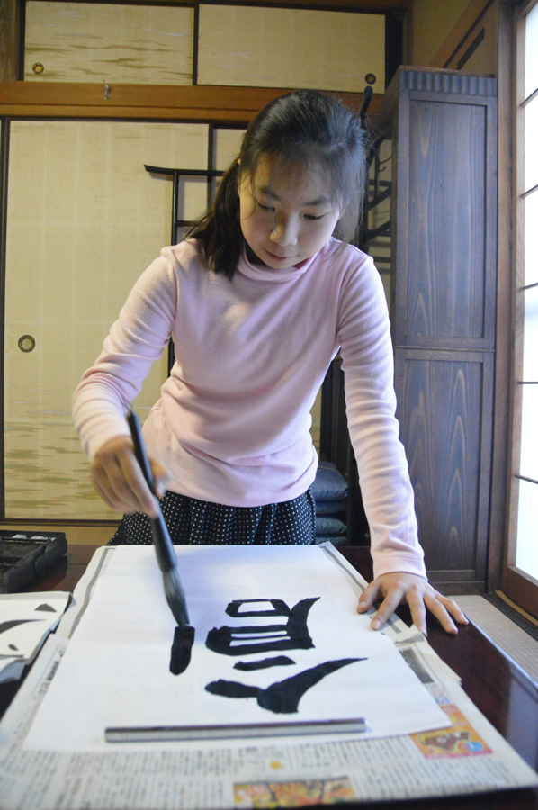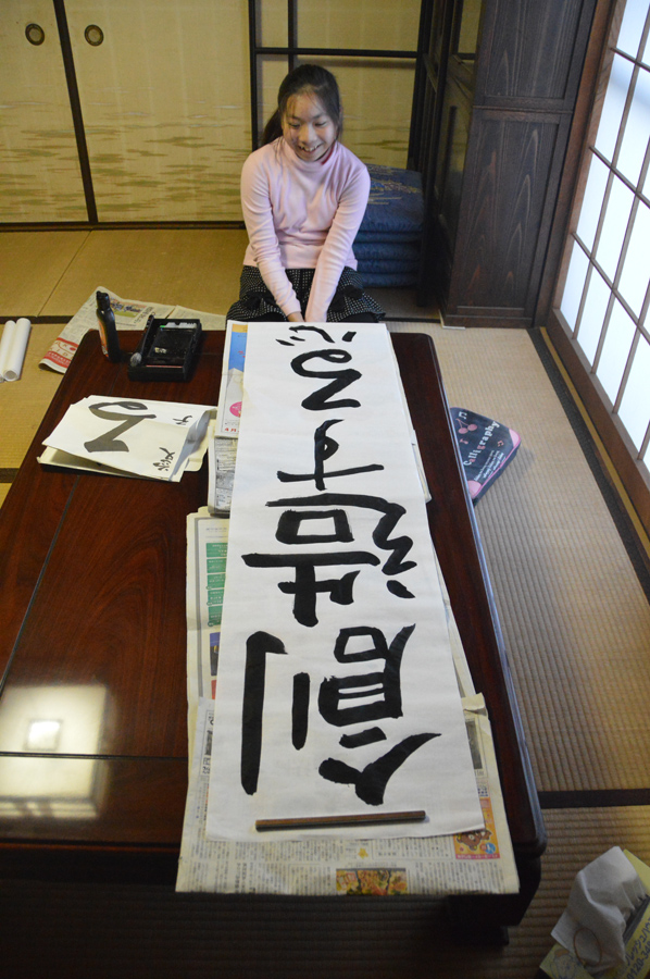 さて、お正月までカウントダウンに入ったこのごろ、皆様げんきにおすごしでしょうか。一年間山ちゃんの写真教室にお付き合いいただきありがとうざいました。来年もよろしくお願いいたします。さて、なにかお正月とか冬休みらしい写真が撮りたい、夏休みは外遊びが多いので撮る機会も多いのですが、冬はなかなかむずかしい。初詣とかかなあと思っていたところ次女が「宿題の書初めおばあちゃんちでやろ~っと」と言っているのがきこえてきました。これも撮っておけば思い出になるよね、と思って実家にカメラとお習字セットを持って行ってきました。今回は書初めのスナップを撮ってみました。