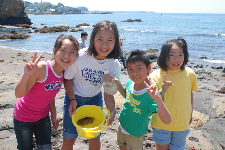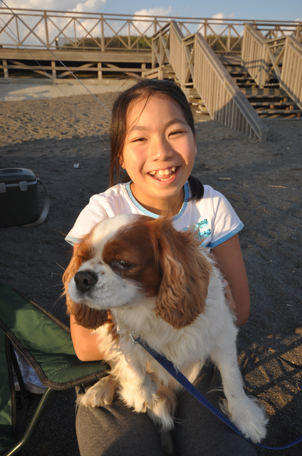 お友達や動物、誰かからもらったプレゼントのようなものでもいいです。何かと一緒に撮る、というのは一人で撮られるより気分がのると思います。小学校の卒業式の時、長女がやはり「パパと一緒に撮ろう」というときはなんだか事務的な感じでフレーミングにおさまっていましたが、お友達と一緒に撮った写真はとても良い表情をしていました。この「お友達と一緒に」はけっこう効果があります。[作例(2)]は実家の犬と一緒に撮った写真で[作例(3)]はお友達と一緒に磯遊びで捕まえたタコを持って撮った写真です。好きな誰かやペットと一緒に、など楽しい状況を狙って撮るといいと思います。特に写真に写るのが好きなお友達がいるときなどはチャンスです。