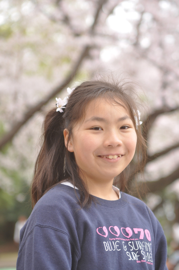女の子の場合きれいなお洋服や髪飾り、花などでちょっとテンションが上がります。[作例(4)]はお花見の時にお姉ちゃんが髪に桜の花をつけてくれたので何枚か撮った中の一枚です。散々駆けずり回って遊んだ後なので髪がぼさぼさですが本人はおしゃれしたつもりになっています。自分で髪に飾ったのではなく、「お姉ちゃんがつけてくれた」のも一つのポイントです。本人は髪がどんな風になっているのか見えませんから、撮ってからモニターを見せてあげるのもいいと思います。「かわいい」とか「きれい」など、気分を盛り上げてあげるのもわすれずに。
