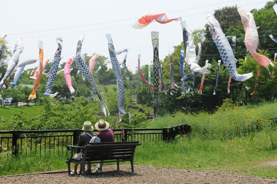 [作例(2)]はこのままでは寂しい感じになってしまうので、手前のベンチに座ってこいのぼりを眺めているご夫婦の後ろ姿を入れてみました[作例(3)]。このほうが、まだ春の気持ち良いイメージに近い写真になると思います。自分が家族と一緒なら、家族に入ってもらってもいいと思います。このような時のポイントは、「気持ちよさそうなイメージ」のモノや人を脇役に使うことです。人物なら春らしい服装などです。[作例(3)]の場合は後姿の二人が中高年の夫婦であることと、女性が背中にデイパックをしょっていることが気持ちの良い休日のイメージを連想させてくれるポイントになっていると思います。背景に山などが入れられるような場所なら、それもいいでしょうし、手前に花などを入れるという手もあります。その時のロケーションを利用して自分なりのイメージを盛り上げる脇役をさがしてみましょう。