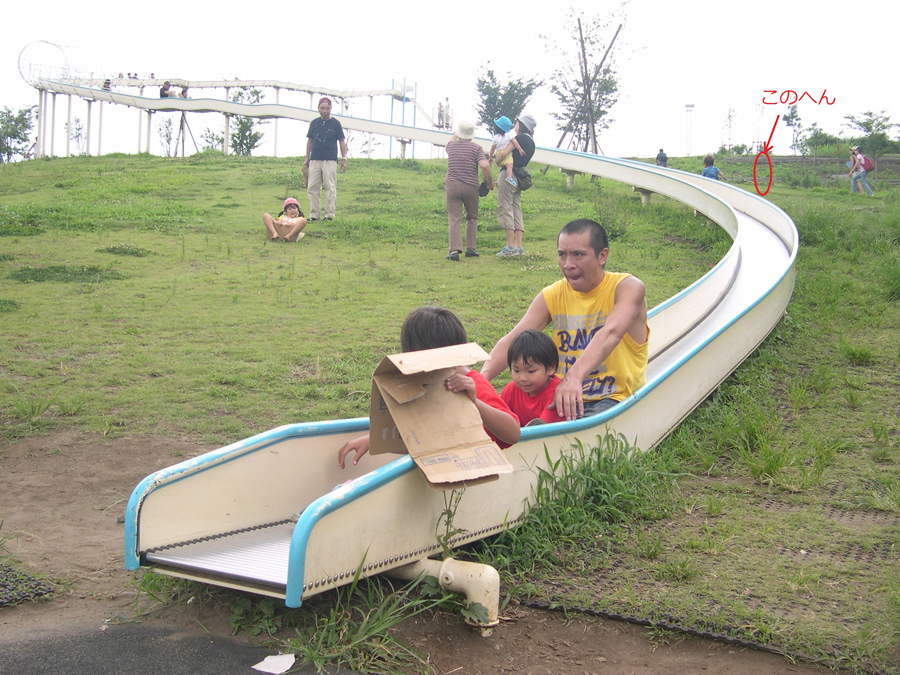 この時は滑り台で滑ってくるところを正面から撮ろうと思っていたので、長い直線部分(滑り台の)の正面になるところから撮りました。作例3は滑り台全体の状況ですが、2回目のカーブのあたりでカメラを構えて待っていると、子供たちが直線に入ったところで何枚も撮ることができます。作例3ではちょうど青いTシャツの子の後ろ姿が写っているあたりです。