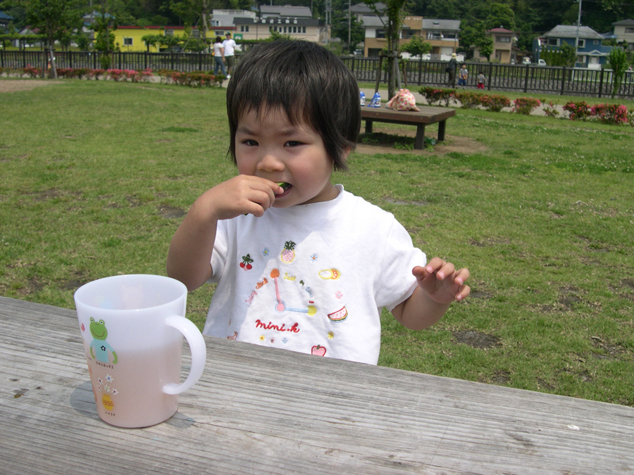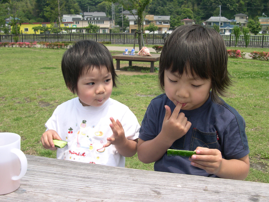 これは正直言って人それぞれの好みによるモノなのですが、私は一人より二人(2人より多くてもいいんですが)の写真が好きです。もちろん一人ずつの写真もたくさん撮っていますが、兄弟が一緒の時は必ず一緒に写っている写真もたくさん撮るようにしています。兄弟や親子のスナップは後で見たときに暖かい気持ちになれます。家族は親子ももちろん子供同士である兄弟でも影響しあって成長していきます。作例4は一人できゅうりをかじっていますが、作例5のほうはお姉ちゃんがきゅうりに振った塩をなめるのを見て真似しているところを撮りました。プライベートな家族写真は撮ったときの思い出とともに楽しむものです。こうして兄弟で楽しく過ごした時間があったことを形に残せることが普通に幸せなことだと思います。