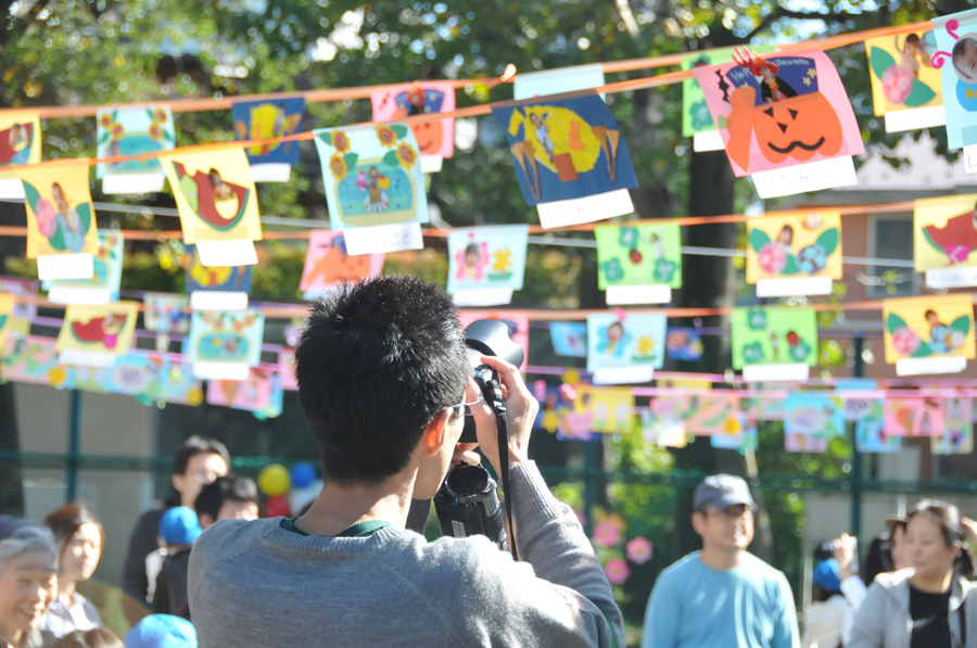 運動会自体が大きくなると会場も広くなります。運動会が大きいということは人も多いわけで、当然観覧できる場所が限られてきますから遠くから望遠で撮るしかありません。今回の運動会は全部で30人いるかいないかくらいの小さな運動会でした。場所は近所の公園を借りて行っていて、あらかじめ先生方が手作りの旗や色画用紙で作った飾りなどを飾り付け、集合するときも子供と親が一緒に集まるなど、家庭的な雰囲気ではじまりました。
