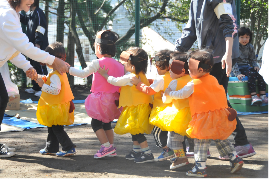 この運動会で飾られていた旗は手作りで、一人ひとりの写真と折り紙で作ったかわいい旗でした。こういう細かいものも撮っておくと記念になりますし、アルバムやフォトブックを作るとき中途半端に空いてしまったスペースを埋めるいい素材になります。[作例(4)]は子供の旗を探して写真を撮っているパパの後ろ姿です。もちろん旗の写真も撮りましたが、それを撮っているパパの姿も思い出になります。競技の合間にはちょっとしたスナップを撮ってみましょう。[作例(5)]は電車のようにつながって歩く姿や前の子の肩に手をかけてついていくしぐさがかわいかったので撮りました。こういった後ろ姿のコツは「何をしているのかわかる」または「なにをしているのか想像できる」ように撮ることです。たとえば作例4のパパの後ろ姿の場合でしたら、パパが何を撮っているのか分かるように旗も一緒にフレーミングすることです。ついでのスナップもたくさん撮ってアルバムに楽しい一日のページを作りましょう。