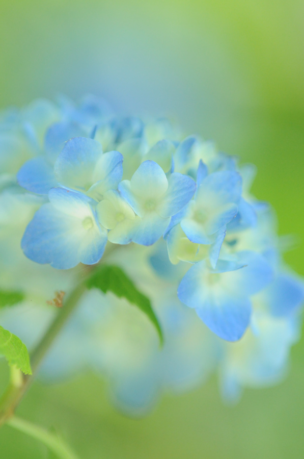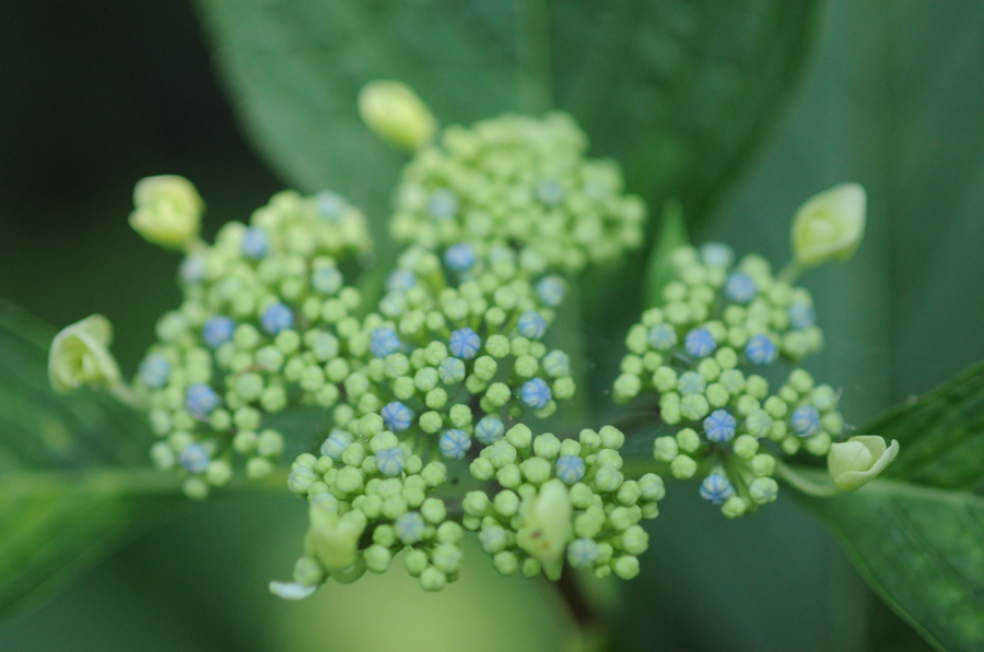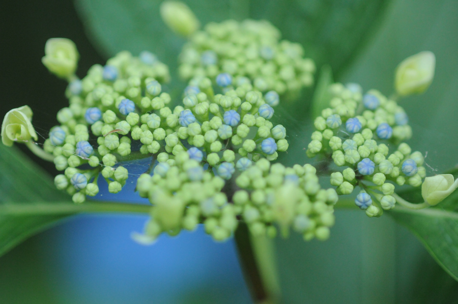 アジサイは青やピンクなどきれいな色の花ですが、咲き始めは色が薄く、咲いていくにしたがって色づいていく花です。咲き始めの花はまだしっかり色づいていないことも多く、その淡い色のイメージがまたよいのですが写真にするとちょっと色がさびしいこともあります。また、白いアジサイやガクアジサイの蕾などもきれいですが色的にちょっと物足りないことがよくあります。このような時は背景に色のある後ボケを入れたり、きれいな色の前ボケを入れると画面が華やぎます。[作例(1)]はガクアジサイの蕾です。ガクアジサイの蕾はマクロでアップにすると和菓子みたいな丸い形でとてもかわいいのですが、このままだとやはり物足りない感じになってしまいます。[作例(2)]は同じガクアジサイですが、後ろに青いアジサイのボケが入るようにちょっと移動して撮りました。こうすると画面に色が入ることで写真にちょっとだけ華やかさを添えることができます。私は白い花が好きなので白いアジサイも撮りますが、主役が白なので、後ボケや前ボケに色のあるアジサイを入れて撮ることがよくあります。このコーナーでも何回かお話したことですが、主役が地味でも背景などに工夫すると写真のイメージが全く違ってくるのでためしてみてください。