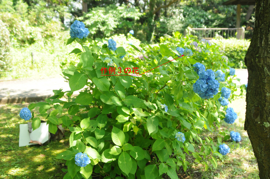 [作例(3)]は日陰のアジサイのアップです。背景が日向の緑なので写真全体が明るいトーンなっています。[作例(4)]は[作例(3)]を撮ったときの状況です。現場は公園の片隅で、写真左側に置いてあるのはこの日レフ板代わりに使っていた白紙です。[作例(3)]を撮ったときもこの白紙のレフを使いました。晴天の場合は明るい部分を背景にすると明るいイメージの写真を撮ることができます。主役の後ろに日向の部分が来るようなアングルを探してみましょう。