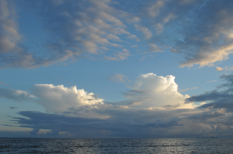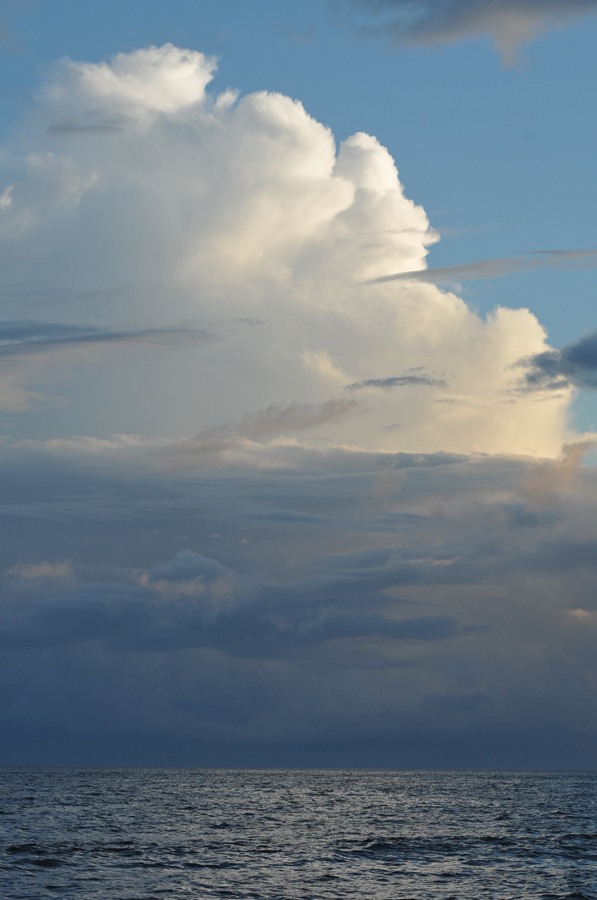 海辺は邪魔な建物もなく空が広く見渡せるので、空の写真を撮るには絶好のロケーションです。作例1は空を広角で撮った状態です。水平線の上に2つの入道雲があります。この右側の雲をアップにして撮ったのが作例2です。やはり大きく撮ったほうが雲にボリューム感が出ます。大きく撮れば迫力が出るのは当然なのですが、できれば地上の風景を少しでも入れたほうがいいと私は思います。地上の風景でなくても飛行機や街頭などでもいいでしょう。このように海で撮るなら船などが入ってもいいですね。どうしてかというと大きさを比較できる対象がなにかしらあったほうが雲の大きさを表現できるからです。作例2では画面の下のほうに少し水面が入っているだけですが、それでも空だけで撮るよりいいと思います。