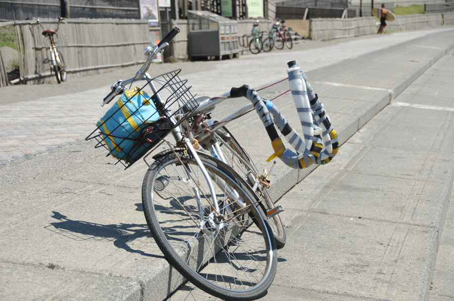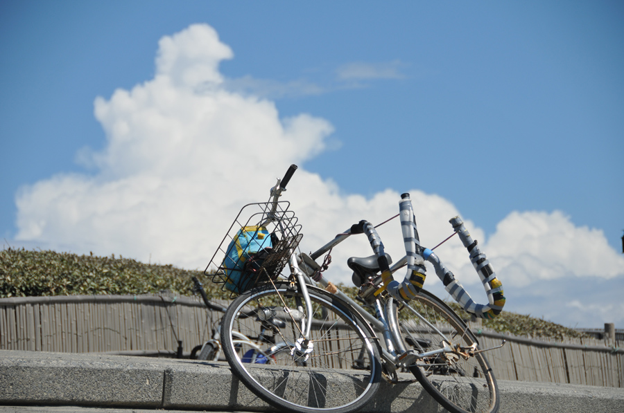夏雲は夏を表現するにはとてもよいアイテムです。被写体には特に季節感がなくても画面に夏雲を入れると夏っぽいイメージが出来上がります。作例3の自転車は砂浜に降りる階段に立てかけてあったものです。地元サーファーがよく使う、ボードを自転車に積むためのキャリアがが付いているので持ち主はおそらく波乗りに来ているのでしょう。作例3のように撮るとただ地元サーファーの自転車が写っているだけになりますが、ちょっと階段を下りて、下からあおるようにしてさらに背景に雲が入るポジションを探して撮ったのが作例4です。こうして撮るとなんとなく夏らしい写真になるのではないでしょうか。夏の雲は画面にちょっと入れるだけでも夏のイメージを盛り上げてくれます。夏雲が出ていたらぜひ活用してみてください。