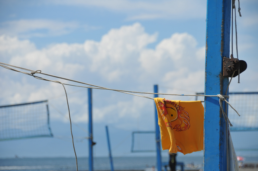 作例4と同様に背景に雲を入れて撮ったのが作例5です。ビーチバレーコートのネットにかかっていた黄色いTシャツを撮りました。自転車と違って地上に置いてあるものではないので地面が写りません。その分背景の空間が大きくなるのでちょうどよい雲をフレーミングできる角度を探して撮りました。このようにかっこいい雲が出ていたら背景に利用してみましょう。主役が人物でも花でもたいていの場合は似合いの背景になってくれます。また青空と白い雲をクリアに見せるにはいつもおすすめしている逆光ではなく順光がおすすめです。そのほうが夏のはっきりした色が引き立ちます。
