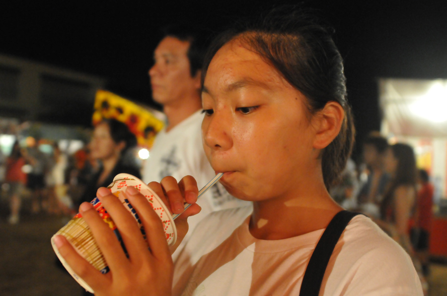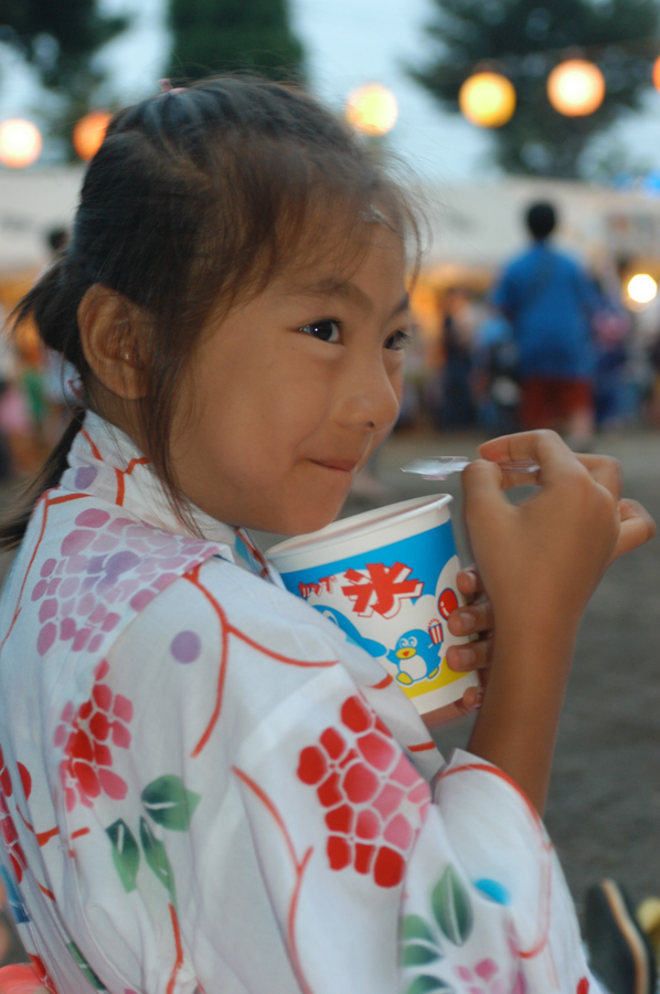 作例1と作例2は近所の公園で毎年開かれている自治会主催のお祭りです。こういった地域でやっている小さなお祭りでは会場もそれほど大きくなく、先々週のねぶたのような大きな山車もありません。作例1は子供がかき氷を食べているところを撮っていますが立ったままシャッターを押しているので背景にほとんど地面しか写っていません。浴衣を着ているので「お祭りかな?」くらいのことはわかりますが、このままではちょっとさびしいですね。いわゆる上手な写真の条件としてよく言われている「背景をシンプルに」という基本は知っている人も多いかと思いますが、お祭りのにぎにぎしいイメージを出すにはあまり背景がシンプルすぎるのも味気ない写真になってしまいます。