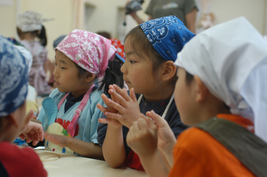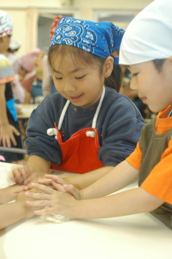 せっかくお料理しているところを撮っているので、今何をしているのかが分かるような写真を意識して撮りましょう。それにはやはり手元が写っているということが大事です。作業している子供の手がはっきり写るようなアングルとシャッターチャンスを狙ってください。作例2は粉を丸めているのがはっきりわかる写真ですが、作例3は手もとが他の子供の手に隠れていてよく見えません。お料理の場合テーブルにボールや調味料のビンなどが置いてあることもあります。顔ばかりに気を撮られて手が陰に隠れてしまわないように気を付けましょう。ちょっとしたことなのですが、これが出来上がりの写真の印象を大きく変えることになります。