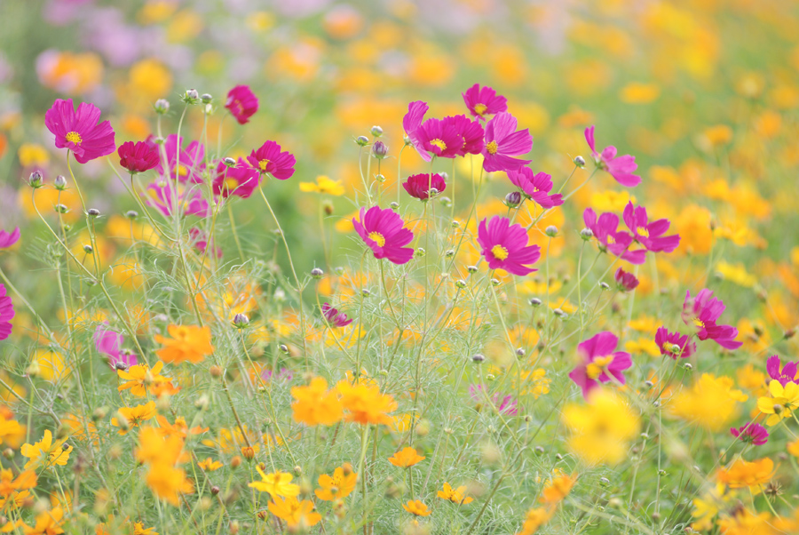 秋の代表的な花にコスモスがあります。秋の花には野の花の印象が強いものが多い気がします。萩や野菊などもそうですがコスモスは野原が似合う花ですよね。と言っても街中できれいに群生しているところはたいてい人が人工的に植えた場所が多く、自然に群生しているという場所にはなかなか巡り会えません。私が毎年コスモスを撮っているのもそんな花畑の一つです。大きな公園の一角にコスモスを植えてある花畑があるので毎年一度は撮りに行っています。今回はコスモスを撮ってみましょう。