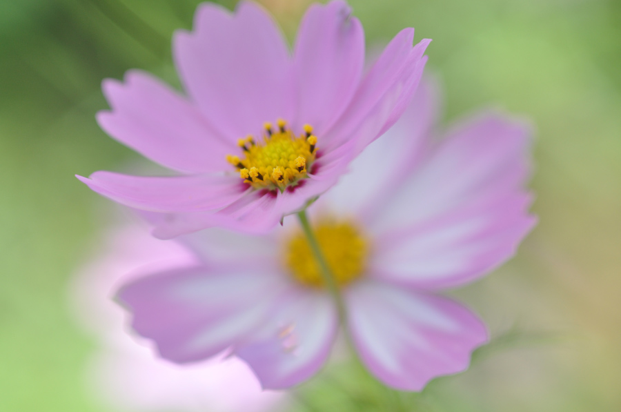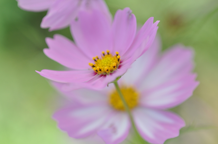 コスモスをアップにて撮ってみました。2つの花が重なるように咲いていたので、上の花にピントを合わせて下の花がボケになるようにしました(作例2)。大きぼかすために絞りはF3.5で撮っています。これくらいアップにするにはマクロレンズがあると便利です。小さな花のアップをとるにはかなり近寄って撮らなければならないため通常のレンズだと近すぎてピントが合わせられません。