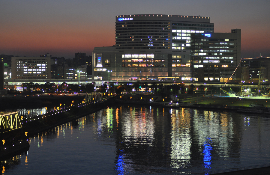 夜景は時間帯によってまったく違う景色になります。まず日没後ですが、日没直後はまだ空に残照が残っています。私は個人的にこの時間帯に撮るほうが日暮れ後の写真を撮るより好きなのですが、なにしろ短い時間なので、一回の撮影ではなかなかバリエーションを広げられないという難点があります。その日の天候や季節にもよるのですが色づいた雲やグラデーションのきれいな空は美しい背景になるので、とっぷり日が暮れた後の真黒な空とはちがったイメージの夜景を撮ることができます。特に建物など背の高いものを見上げるように撮る場合など、空がフレーミングに大きく入る場合は空がきれいなほうが絵になります。作例1、2と同じ場所で作例3の写真も撮りましたが、これはもうすっかり日が暮れた後ですので空は黒く写っています。どれがよいかは人の好みによるものなのですが、同じようなフレーミングで撮っても時間帯によって夜景の状況は変わるものだということを把握しておきましょう。あとは自分の好きな時間帯に撮ることができればよいかと思います。