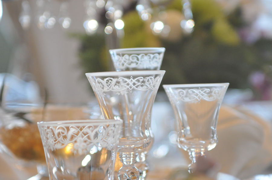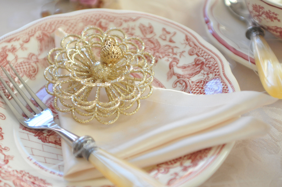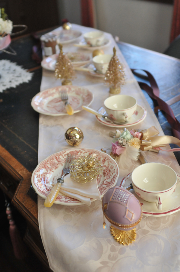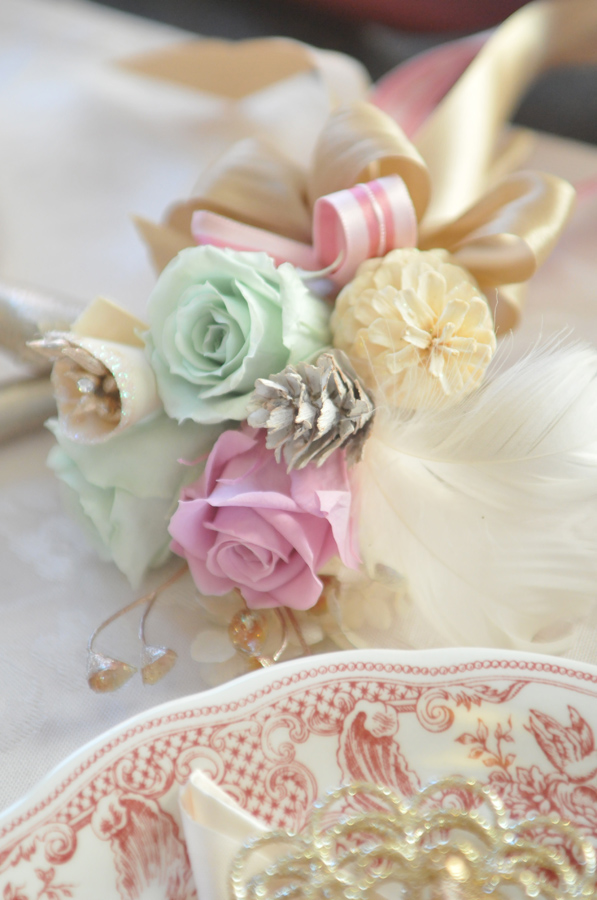 作例1は洋館の一室にあったテーブルセッティングの様子です。こういった観光施設はトップシーズンは混雑していることが多いので、あまり自由度の高い撮影は期待できません。この時も部屋全体を撮ろうとすると必ず人が入ってしまうため、テーブルだけを撮りました。このテーブルの飾りの中から気になるものを探してアップで撮ると一つの場所でいろいろな写真を撮ることができます。作例2は作例1の手前のお皿のアップです。この作例の場合はゴールドの花の小物を主役にしましたが、小物を画面中央ではなく少しはずしてフレーミングしました。作例3は作例1の奥のほうでボケになっている小さなツリーのアップです。作例4は作例2のお皿のそばにある小さなブーケのアップです。