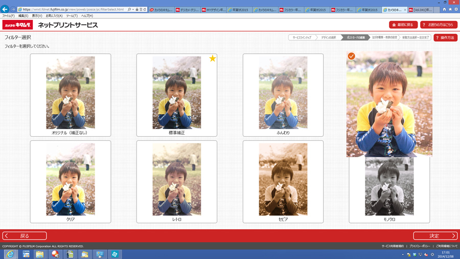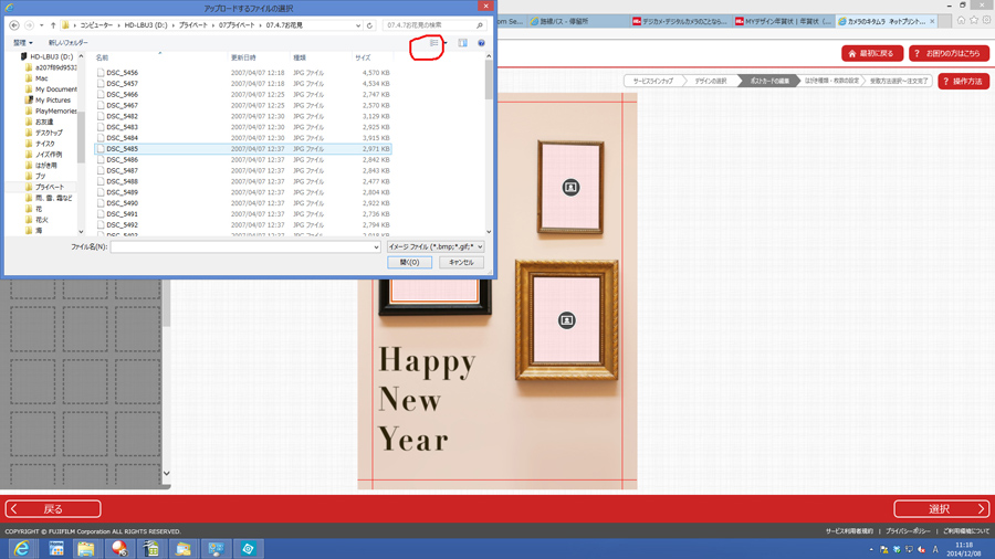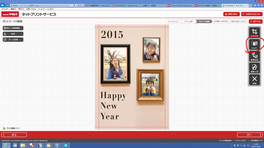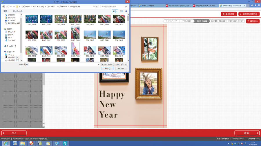 キタムラオリジナルのテンプレートではなかったのですが、キタムラのHPから年賀状を注文するを選択し、フジカラーの年賀状を選んで進むとおしゃれ年賀状「LETTERS」というシリーズがあります。この中の「フォトフレーム」もしくは「写真風デザイン」を選択すると、以前紹介した写真を写真に撮って年賀状用写真を作る、のと同じようなイメージの画像を作ることができます。以前紹介した方法だと、レフなどを用意して写真プリントを撮影するという手間がありましたが、これならパソコン上で簡単に作ることができます。
