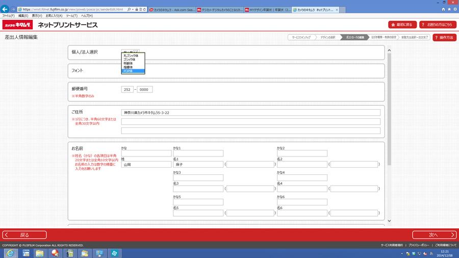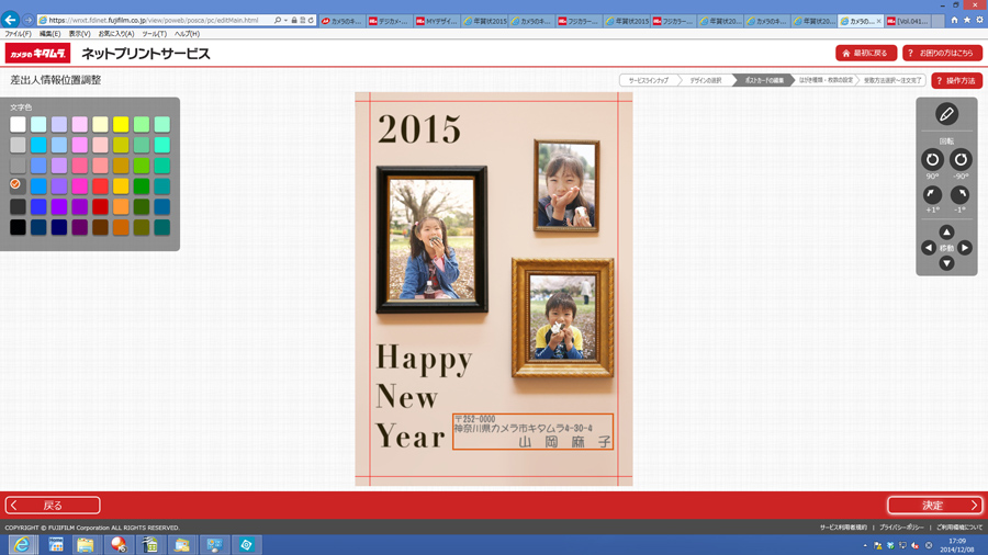 私がこのハガキを作ってみたのはちょうど早割の締切日の午前中でした。どうやらアクセスが集中していたらしく、作業の区切りのたびにかなり待たなければならず、一度は「混雑しているため時間をおいてから~」というメッセージが出るときもありました。やはりこういった作業は早めにやるに越したことはないようです。夜になってからもう一度やってみたら今度はスムーズに作業できました。おしゃれ年賀状LETTERSにはその名の通りおしゃれなデザインのテンプレートがたくさんありました。皆さんも一度使ってみてください。