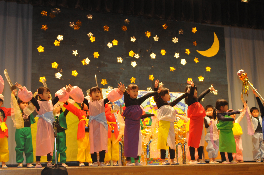 発表会などでは背景の絵やセットも子供たちの手作りの作品であることが多いです。そんなときは背景の絵全体が入る引いたカットも1枚ほしいですね。作例1~3のような場合は難しいかもしれませんが体育館のように高さのあるステージでやる発表会ならそれも可能です。特に、発表会では最後に全員がステージに出てきてポーズをとったり並んで挨拶をする、という場面がよくあります。そのタイミングで背景の絵全体が入るように撮るといいと思います。作例4は劇の最後にみんなでポーズを撮ったところを撮りました。舞台に少人数しかいないときに全体を撮ると寂しい感じになってしまいます。なるべく舞台上がにぎやかな状態で全体を撮るのがコツです。