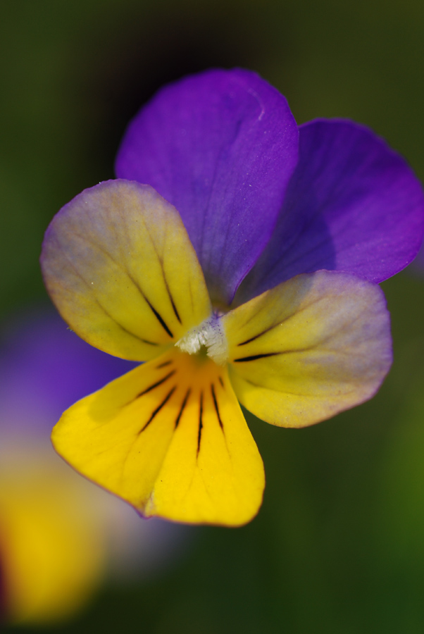 ビオラは背の低い花です。草花という感じの小さな花で、たいていは上から見下ろすように眺めていることがほとんどではないでしょうか。もうちょっとこの花の可憐な感じを出したかったので、低いアングルから前後をぼかして撮ってみました(作例3)。だいぶいい感じではないでしょうか。地上10cm程度の高さの花を低いアングルから撮るのは大変ですが、頑張って撮ってみました。最初よりだいぶいい感じになってきましたがもうちょっとねばってみましょう。