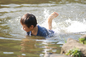 最近の大きな公園には水遊びのできる池などがある公園がたくさんあります。私がいつも子供たちを連れて行っていた公園もかなり大きくて長い斜面を利用した長い滑り台と大きな池とトランポリンがありました。今回は池で遊んでいるところを撮った作例を使ってお話しします。防水タイプのコンデジ等なら心配ないことなのですが一眼レフで撮る場合は水にぬれないように注意しなければなりません。池のそばでは子供たちの水しぶきがかかってしまうこともあります。しかし、できれば楽しそうな表情はアップで撮りたいですよね。望遠レンズがあれば遠くからアップで撮ることができるので、水にぬれる心配がありません。作例1はDXサイズの一眼レフに200ミリまでの望遠ズームをつけているのでフルサイズに換算すると代替300ミリくらいの望遠になっているはずです。高倍率ズームなどが一本あると便利です。