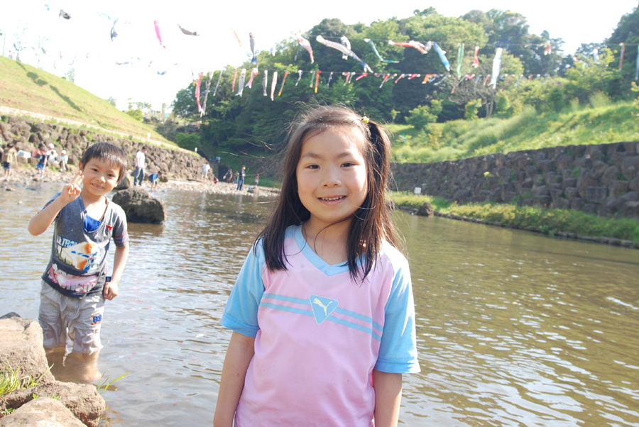 作例3は21ミリの広角で撮りました。望遠で遠くから撮ると画角が狭くなるので、写る範囲が狭くなります。周囲の状況も一緒に撮りたいときは広角を使って撮りましょう。広角では広い範囲が写るかわりに遠くのものは小さくしか写りませんから子供を大きく写すには近くから撮るしかありません。作例3では子供を池の端に呼んで、近くに来てもらって撮りました。広角で撮ることで広い池の様子や上のほうに泳ぐ鯉のぼりも画面に入れることができました。