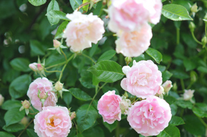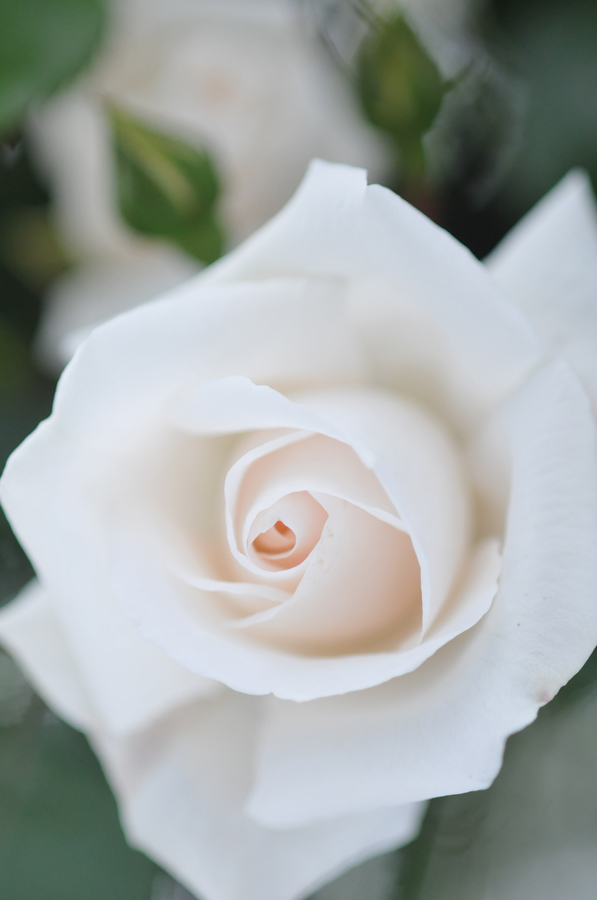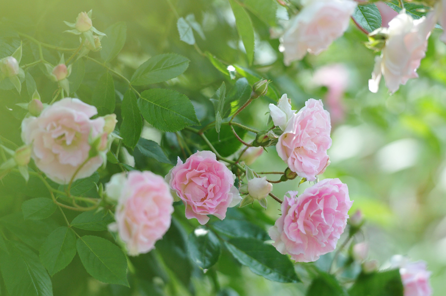 主役のバラだけでなくその周辺にも気を付けて撮ってみましょう。画面内にちょっと遠い部分が入るようにするとその部分がやわらかいボケになってくれるので画面全体をソフトなイメージにすることができます。作例5は画面右側に空いた空間に遠い緑が重なるようにフレーミングしました。そのおかげでこの部分が明るく柔らかい後ボケになっているため写真全体がふわっとしたイメージになっています。一方作例6はここまで大きくぼけるような後ボケが画面内にありません。比べてみると写真全体の印象が大きく違うのがわかると思います。