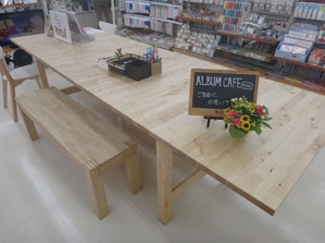 地元のキタムラに行ったときお店の中央に大きなテーブルとベンチがあるのに気が付きました(写真1)。最近は本屋でもちょっと立ち読みできるようなコーナーが作ってあるのを見かけたことがありますが、キタムラのテーブル何のためかな、と思っていました。フォトブックの見本なんかが置いてあったので、それを眺めるためかと思っていたらテーブル上にマスキングテープやはさみが入った箱があり、「ご自由にお使いください」と書いてあります。店員さんに聞いてみたところキタムラではアルバムカフェというものをやっていてその一環としてこのコーナーがあるとのことでした。今回はお店の人にアルバムカフェについてきいてみました。