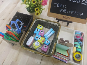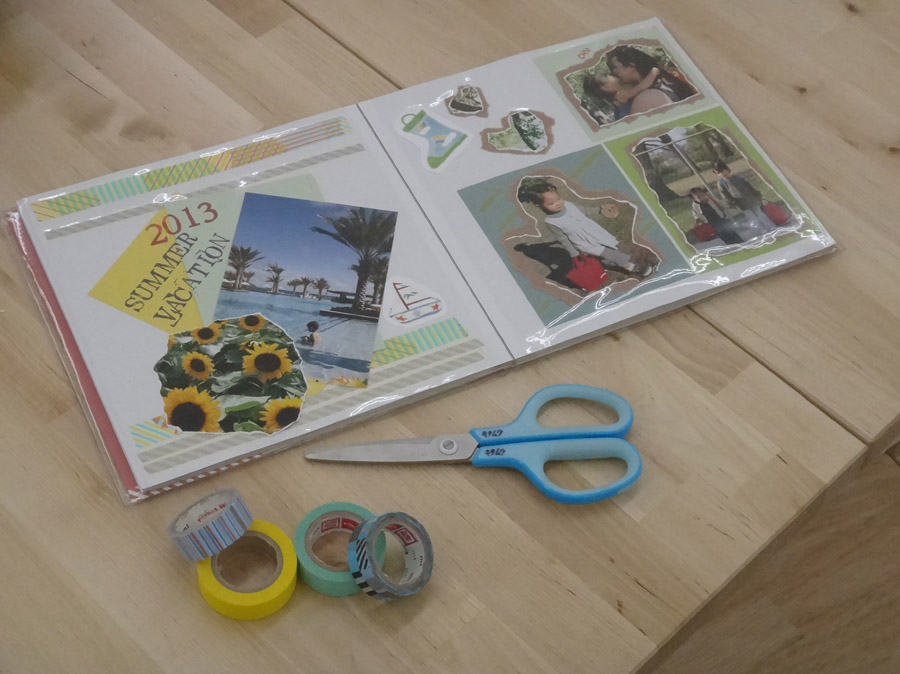 このアルバムカフェの魅力の一つがいろいろな材料を使うことができるという点です。自宅で同じことをやろうとすればできなくはありませんが、色紙にしてもマスキングテープにしても自分一人で買いそろえられる量には限度があります。どのページにも同じテープを使うことになってしまったり、ちょっとしか使わずに残ってしまう色紙がでることもあると思います。逆にちょっとだけ違う色がほしいけど買ったら絶対余る、ということもあります。ここならたくさんある材料の中から好きなものを選べますし、セロファン紙などちょっと使いたいけど自分では買わないような材料も使うことができます(写真4)。それに私にも覚えがありますが、自宅にいるとどうしても家の雑用をやってしまい、ゆっくりアルバムを作るための時間を作ることがなかなかできません。こういう場があると思い切ってアルバム作りができていいなあ、と感じました。