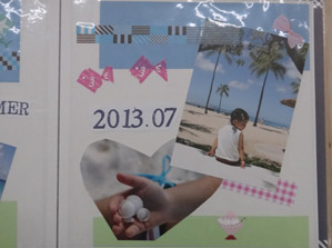 私も初めて聞いたアルバムカフェ。お店のアルバム大使さんにお話をきいてみました。デジカメになってからというもの写真をプリントする機会が減っているということを前から感じていましたが、私個人は以前から「家族の写真こそはプリントで残すべき」と内心思っていました。このアルバムカフェはやはりお客さまにプリントを楽しんでもらおう、という目的で始まった企画だそうです。アルバムカフェは自分が撮りためた写真を使ってアルバムを作ことができる場です(月1~2回開催)。カフェの日にはアルバム大使さんが一人ついてくれていろいろ教えてくれます。写真をデータで持ってくればお店でプリントして、お店で用意してくれたマスキングテープや色紙などを自由に使って楽しいアルバムを作ることができます。写真2はテーブルに普段からおいてある道具と材料ですがアルバムカフェの日はもっとたくさんの材料が自由に使えます。今のところ一回にだいたい5~6人くらいのお客様が集まってアルバムを作っています。たくさんある見本(写真3)の中から「こんなページが作りたい」と言えばアルバム大使さんがその見本のレイアウトやデザインのコツを教えくれるので、初めての人でもおしゃれなアルバムを作ることができますし、もちろん自分のセンスでアルバムを飾ることもできます。