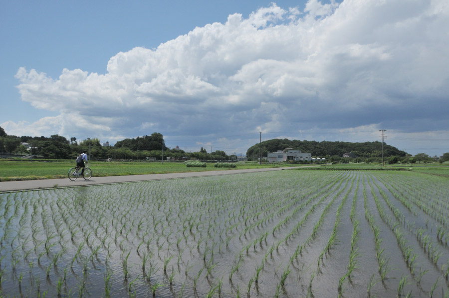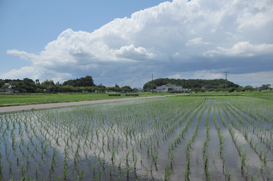 この日は天気が良く立体感のあるクッキリした雲が空に浮かんでいて写真を撮るにはちょうどいい空模様でした。水田は水深が浅いため風のない日を選べば空の表情を水面に写しこんで撮ることができます。なるべくまだ小さい苗が植わっている田んぼを選んで空の雲を水面に映しこんでいるところを撮りました(作例1)広角レンズを使ってちょっと低めのアングルから撮ることと、画面を上下に2分割するように地平線を中心にフレーミングするのがコツです。こうすると空の雲と水面に映った雲が上下にシンメトリーになる様子がひきたちます。作例1は18ミリの広角で撮影しました。