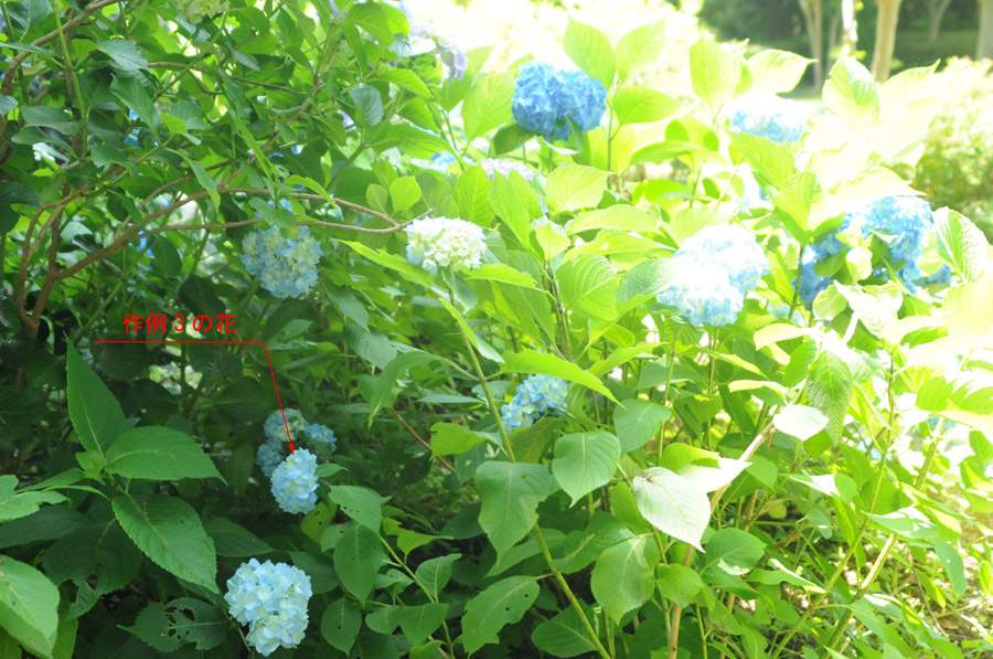 作例3は→で示した日陰の花をアップで撮った写真です。奥のほうの3つの花を後ボケにしました。こうすれば晴れていてもしっとりとしたイメージでアジサイを撮ることができます。